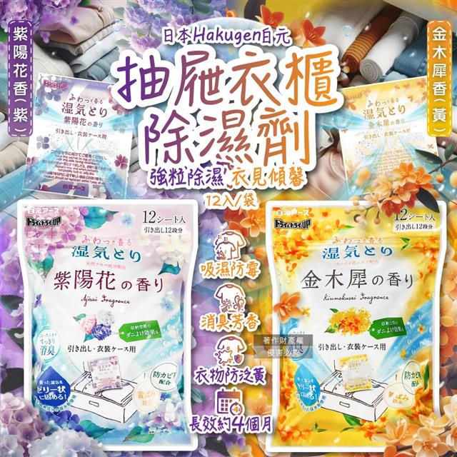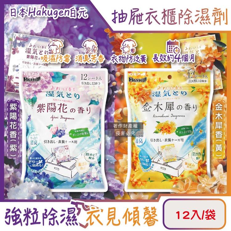 日本Hakugen白元-抽屜衣櫃收納箱用乾燥防霉消臭香氛除濕劑12入/袋(DRY&DRY UP氯化鈣顆粒吸濕片/衣物脫臭防泛黃/淨味透明防潮集水袋)