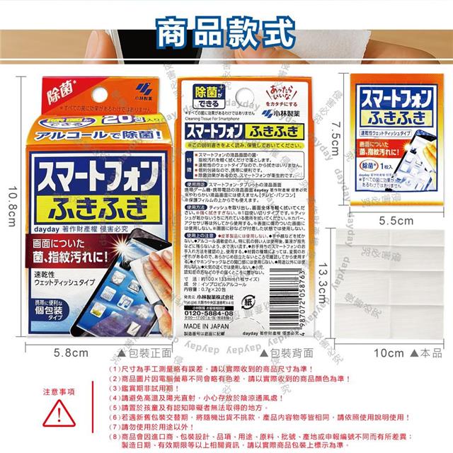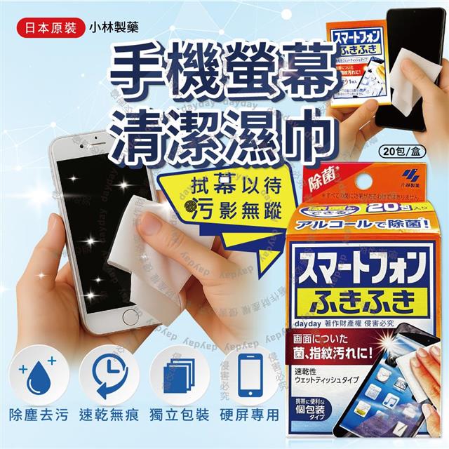 日本Kobayashi小林製藥-去污速乾拋棄式清潔濕巾20包/盒-手機螢幕用(平板遊戲機保養除塵拭鏡紙/保護貼指紋髒污擦拭布/便攜獨立包裝濕紙巾)