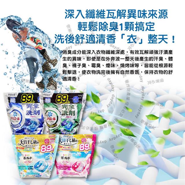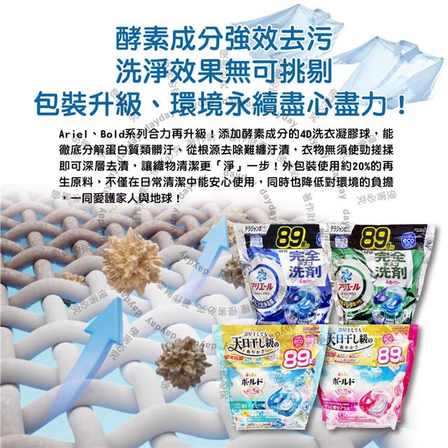 日本P&G-4D酵素強洗淨去污消臭洗衣凝膠球89顆/1袋(Ariel室內晾曬洗衣槽防霉/Bold持香柔順抗褶皺/濃縮洗衣膠囊/家庭號補充包/全洗衣機型適用)
