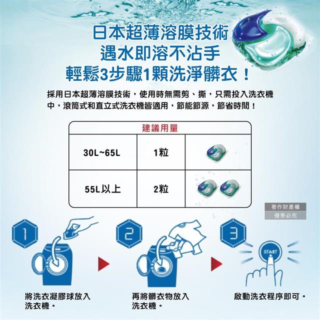 (2)水量55L以上,使用2顆洗衣球更持久消臭。