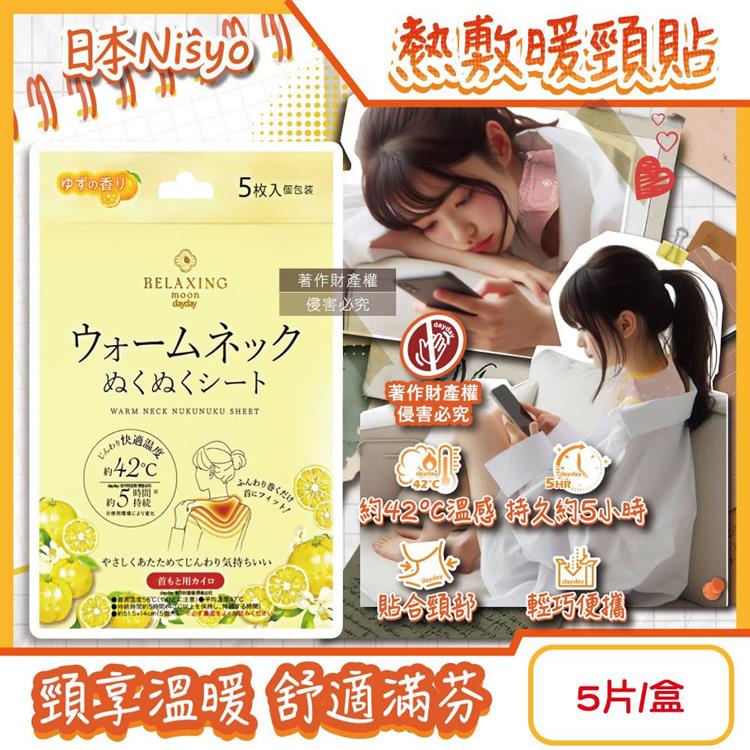日本Nisyo日翔-便攜1次性約42°C舒適溫感熱敷暖頸貼5片/盒-柚香(黃)(Relaxing moon掛脖暖暖包/頸部溫熱貼布/就寢前保暖肩頸/持久約5小時)