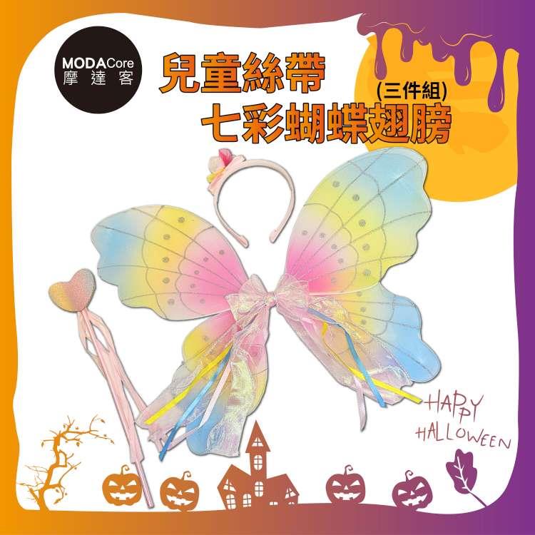 摩達客萬聖★Cosplay派對裝扮變裝★兒童絲帶七彩蝴蝶翅膀三件組 翅膀/髮箍/手杖
