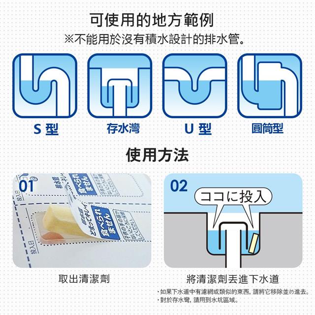 ●非強酸強鹼、非含氯清潔劑,不挑材質、任何材質的排水管都可以使用。