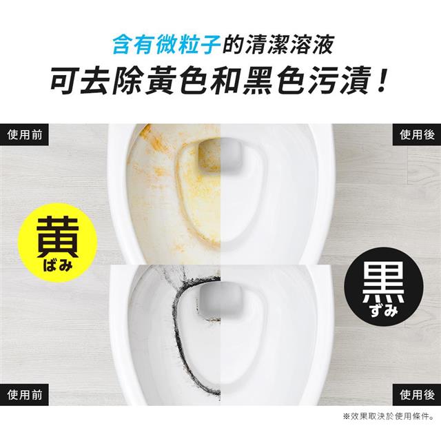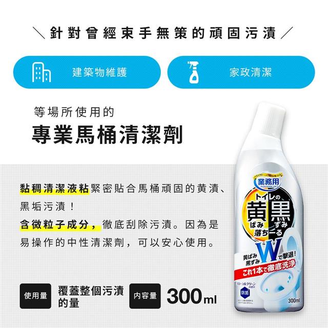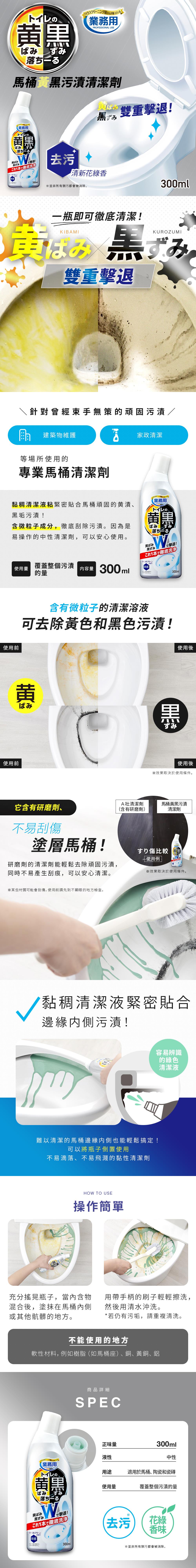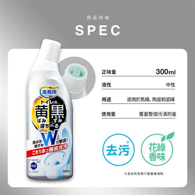 房屋清潔公司使用的專業廁所黄漬和黑漬清潔劑。含微粒子的清潔液,徹底刮除污漬!僅需一瓶,雙重攻擊黄漬和黑漬!低滴落、低飛濺的黏稠型。綠色清潔液便於觀察噴灑位置。清新花綠香。
