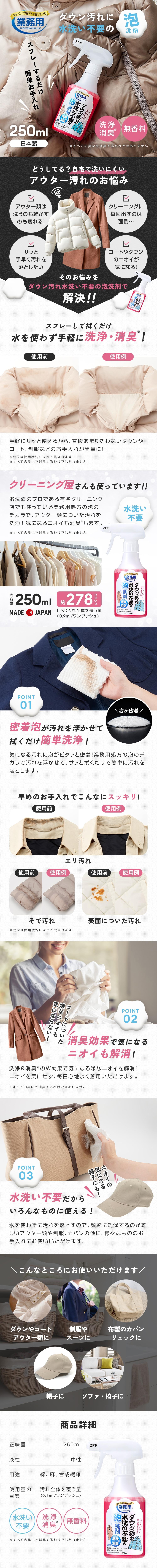 平時不常清洗的羽绒服、大衣、制服等的保養變得簡單。無需水洗即可去除污漬和異味,這是日本洗衣店使用的專業用羽絨泡沫清潔劑。只需噴灑後擦拭即可,使用非常簡單。※並非能消除所有異味。