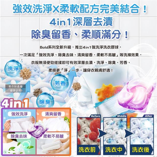 ●品名:Bold強洗淨4合1消臭柔軟香氛洗衣凝膠球