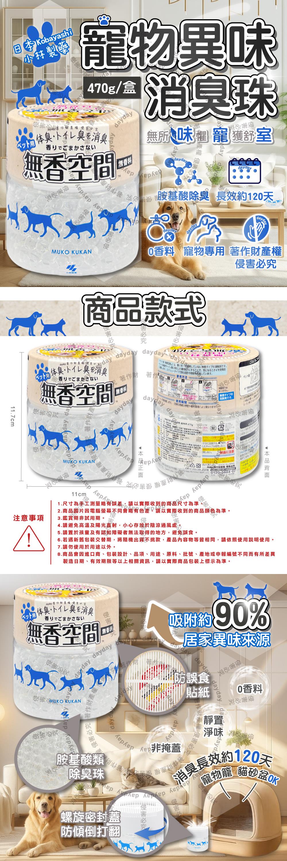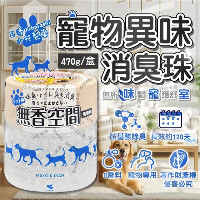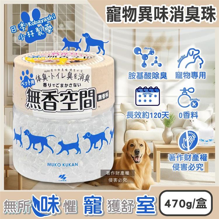 日本Kobayashi小林製藥-寵物專用無香空間室內異味消臭珠除臭劑470g/1圓盒(寵物籠貓砂盆淨味晶球/居家放置型空氣清新/分解毛孩體味尿騷便臭)