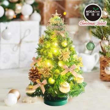 摩達客-台灣製1尺30cm精緻綠色聖誕樹+聖誕花糖果金系裝飾品組_免組裝+20燈LED銅線燈串暖白光-USB電池盒兩用_本島免運費