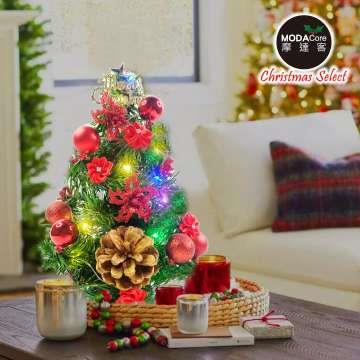 摩達客-台灣製1尺30cm精緻綠色聖誕樹_聖誕花松果雙紅系裝飾品組_免組裝+20燈LED銅線燈串彩光-USB電池盒兩用充電_本島免運費