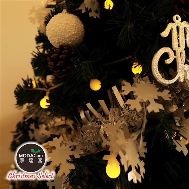 摩達客-台灣製6尺/6呎(180cm)豪華型裝飾綠色聖誕樹/銀白大雪花白果球系全套飾品組+100燈LED小圓球珍珠燈串(暖白光/USB接頭) *2串/本島免運費