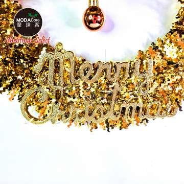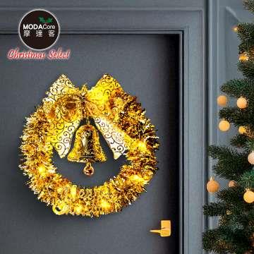 摩達客14吋璀璨金運系金蔥彎絲聖誕花圈+20燈LED暖白光燈串