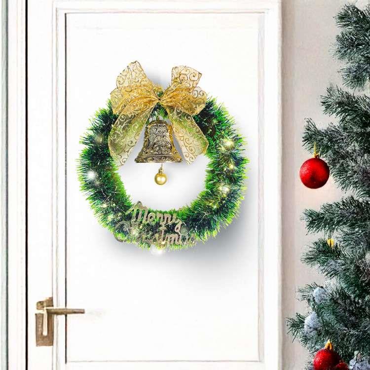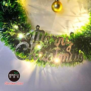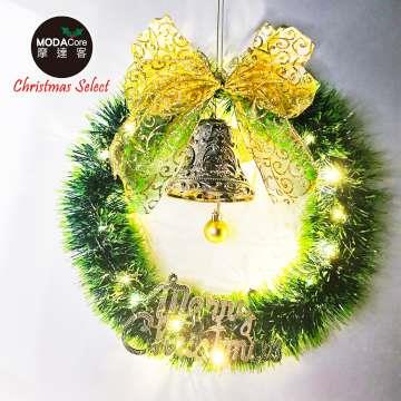 摩達客14吋森林雙綠漸層系金蔥彎絲聖誕花圈+20燈LED暖白光燈串