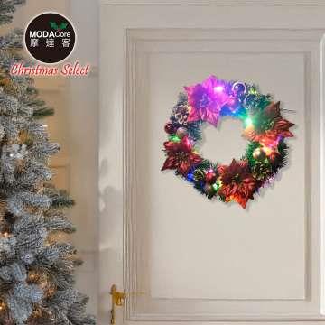 摩達客14吋浪漫朵朵聖誕花豪華綠色聖誕花圈福臨圈_紅金系+20燈LED彩光燈串
