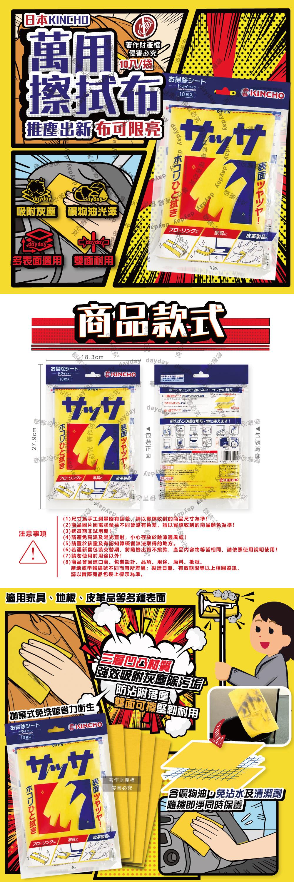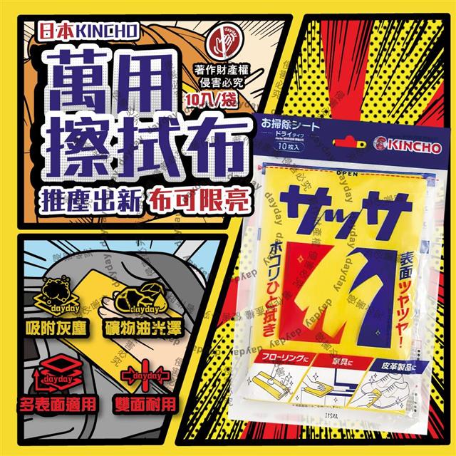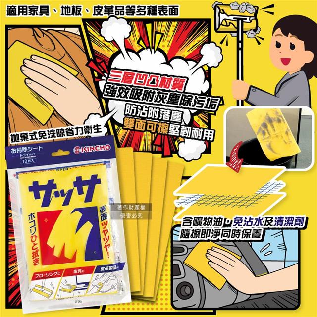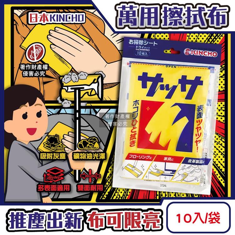 日本KINCHO金鳥-拋棄式免沾水除塵光澤三層雙面清潔萬用擦拭布10入/1袋(居家多用途一次性除塵紙/凹凸纖維乾式紙巾/家具地板掃除百潔抹布)