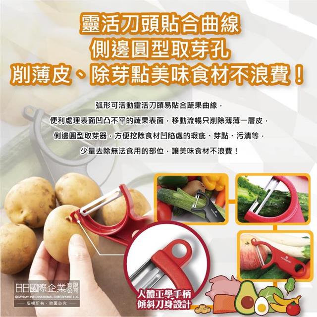●靈活刀片+圓型取芽孔,貼合蔬果削薄皮、除芽點,軟硬通削食材不浪費!