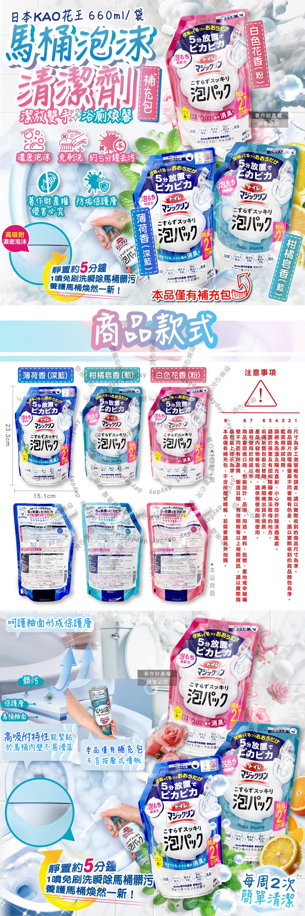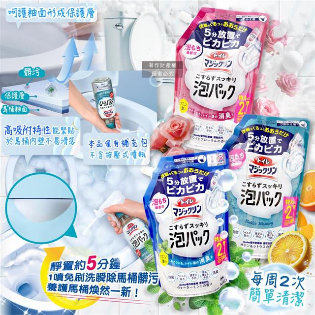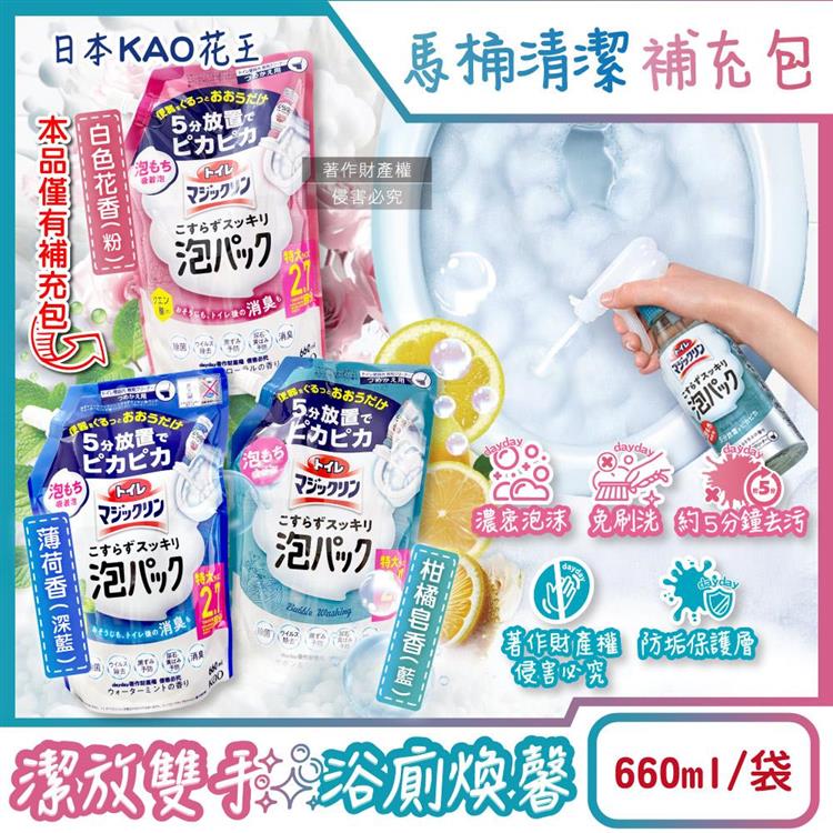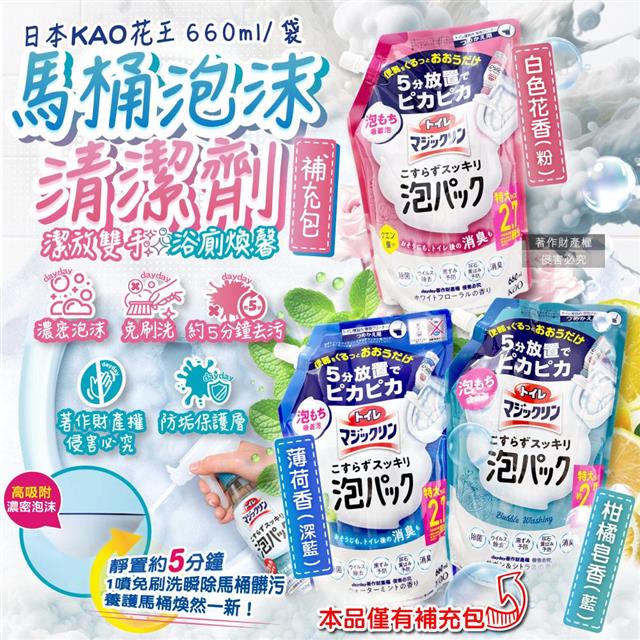 日本KAO花王-馬桶免刷5分放置高吸附去污消臭泡沫清潔劑補充包660ml/1袋(內壁除黑垢洗淨液/去黃漬尿垢洗劑/弱鹼性泡泡芳香潔廁噴劑)