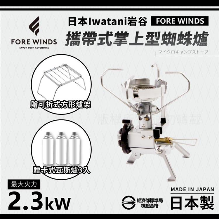 【Iwatani岩谷】Forewinds攜帶式掌上型蜘蛛爐-附收納盒-2.3kW+專用可折式爐架+搭3入瓦斯罐 (FW-MS01+NB01-GO-08+瓦斯罐3入)