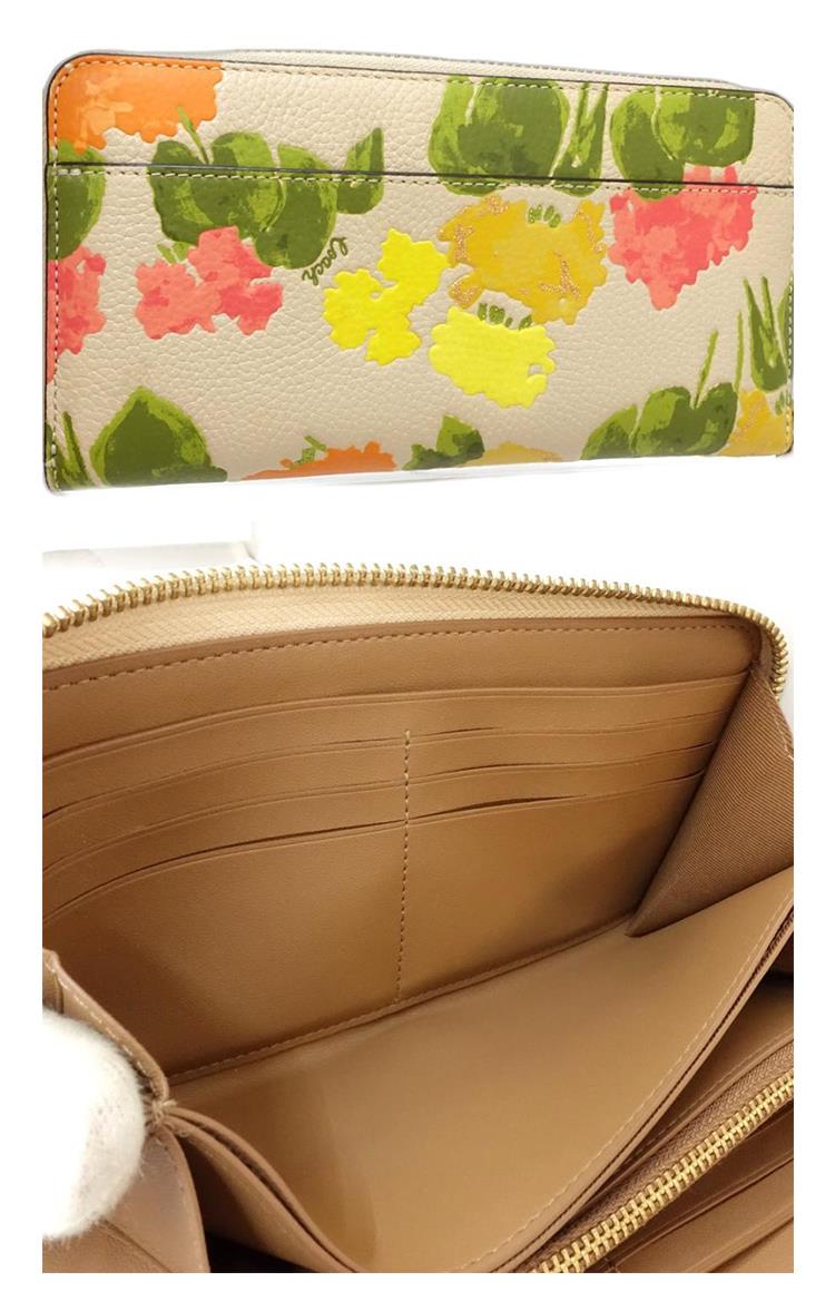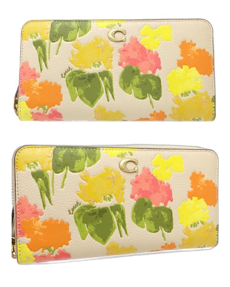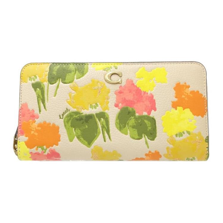 COACH 印花皮革拉鍊長夾-黃綠桔花朵