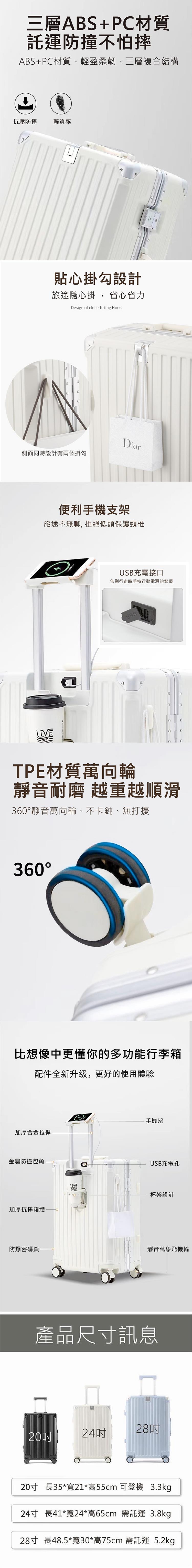 全新ABS+PC三層結構,防撞耐壓再升級,合金護角保護更全面。加厚三段金屬拉桿搭配手機架,追劇導航超便利。TSA海關鎖,國際通關更安心。Type-C與USB雙充電孔,移動中不怕沒電。摺疊杯架可放飲料雨傘,箱側掛勾輕鬆掛小包。360°萬向飛機輪,推行滑順不卡卡。行李箱推薦,家庭旅行、商務差旅必備!