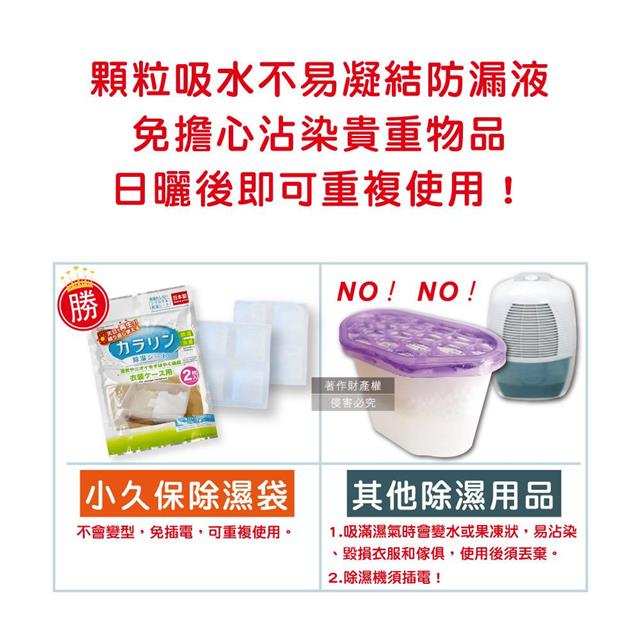 ●顆粒吸水不易凝結防漏液,免擔心沾染貴重物品,日曬後即可重複使用!