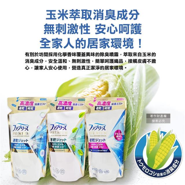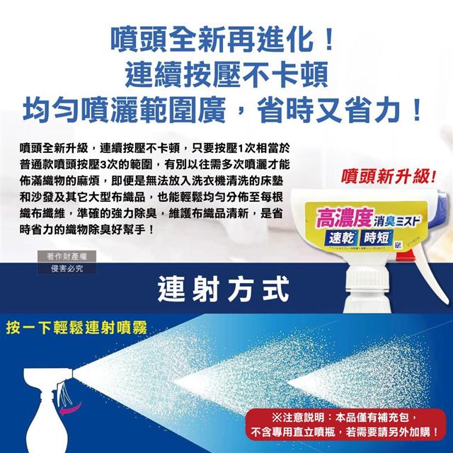 ●品名:布織品專用速乾時短高濃度超細密消臭噴霧補充包