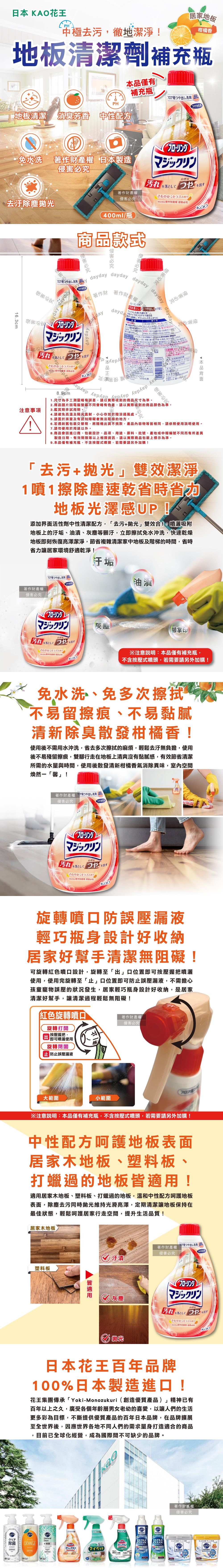 日本KAO花王-居家地板去污拋光中性噴霧清潔劑400ml/淺橘瓶-柑橘香(木地板專用/免水洗/芳香消臭/速乾去垢劑/塑料板/打蠟過的地板皆適用)