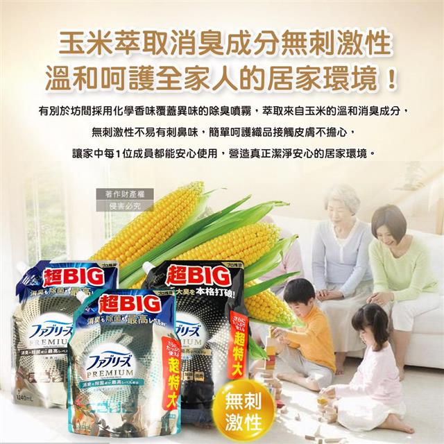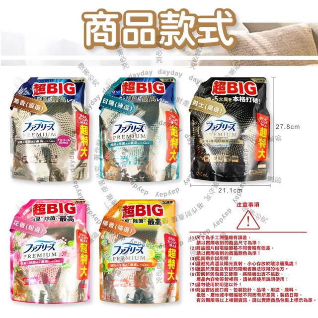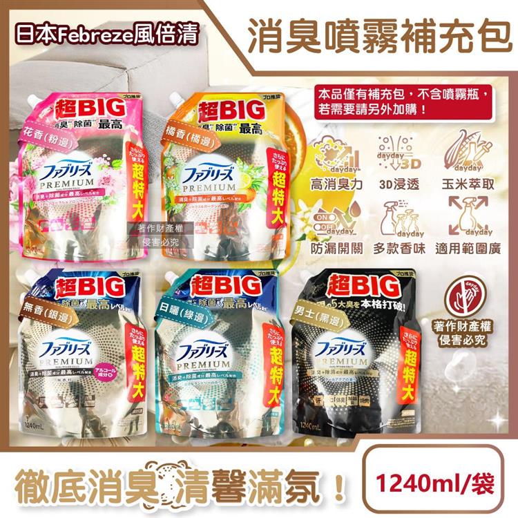日本Febreze風倍清-高消臭力3D浸透織品除臭噴霧補充包1240ml/袋(超BIG衣物香氛/鞋靴消臭劑/去燒烤食物異味/,寢具床墊地毯沙發窗簾適用)