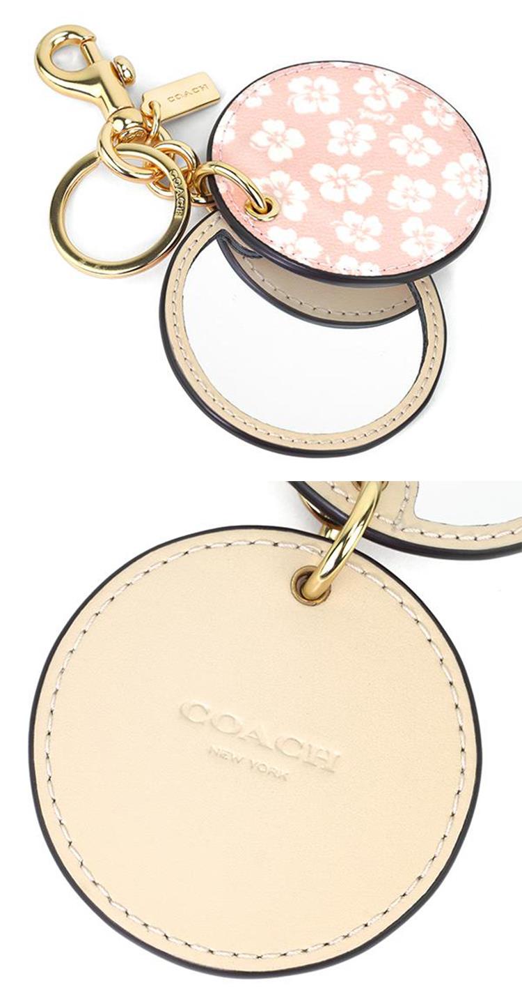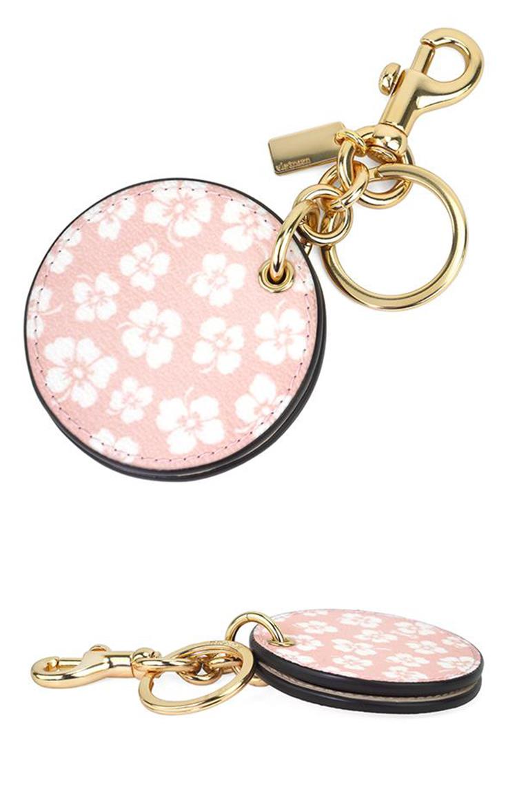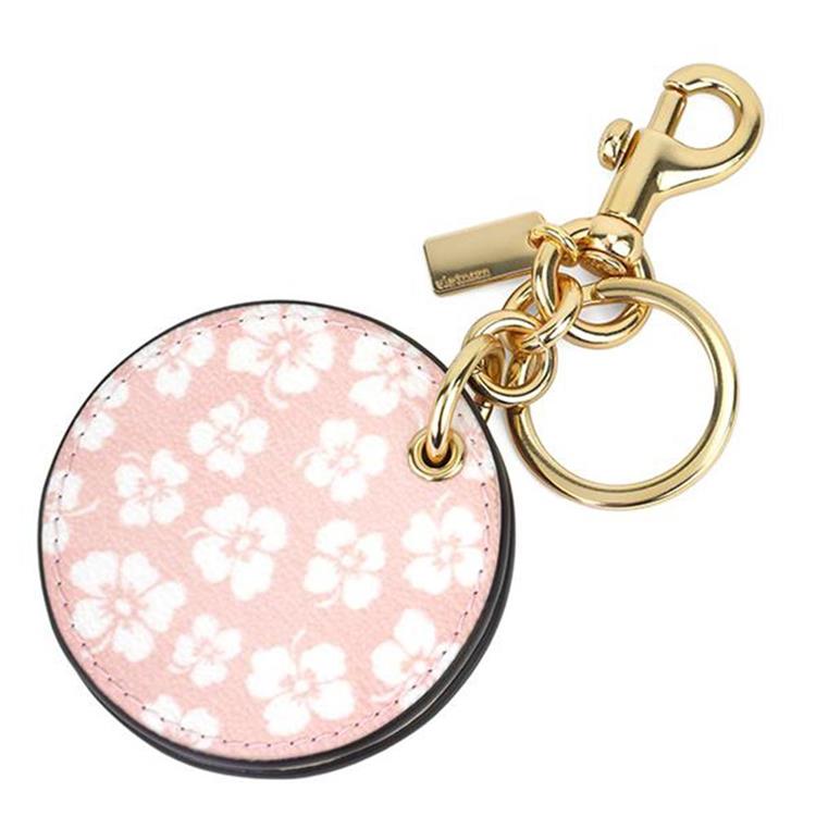 COACH 圓形印花皮革化妝鏡鑰匙圈/吊飾-粉白花朵