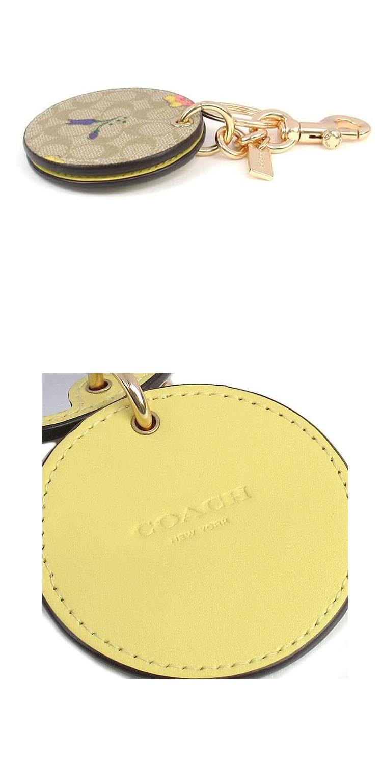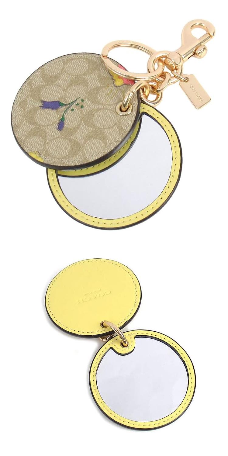 COACH 圓形印花皮革化妝鏡鑰匙圈/吊飾-淺卡其淺黃小花