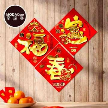 摩達客◉春節開運招財◉質感燙金仿絨招財進寶春福斗方3片組春聯牆貼
