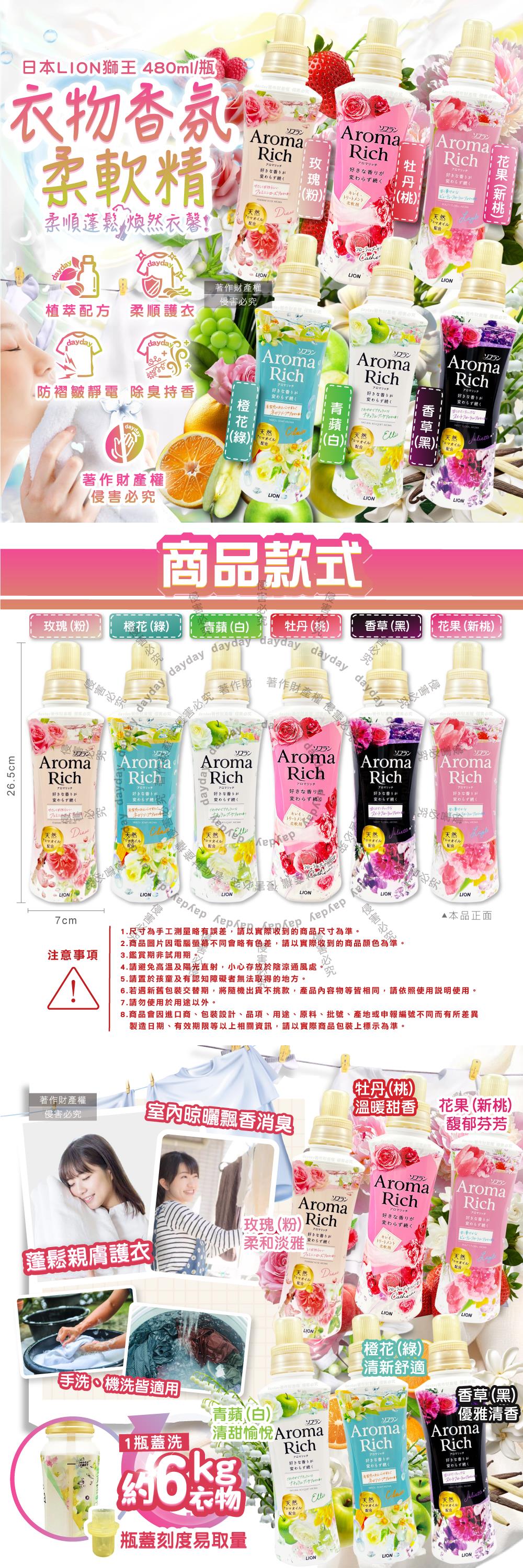 日本LION獅王-Aroma Rich長效除臭蓬鬆防褶皺衣物香氛柔軟精480ml/瓶(織物防靜電褪色消臭持香柔衣精/室內晾曬芳香護衣精/貼身衣物手洗精)