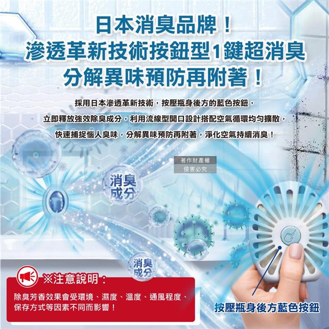 日本消臭品牌!滲透革新技術按鈕型1鍵超消臭,分解異味預防再附著!商品介紹