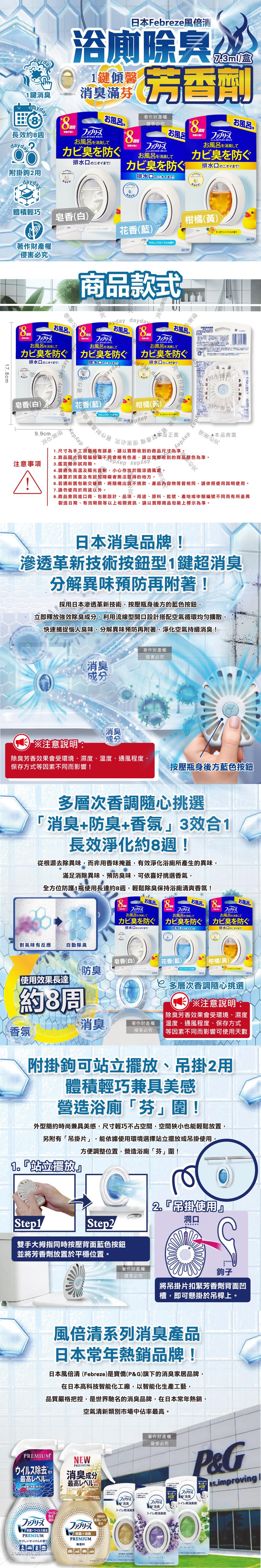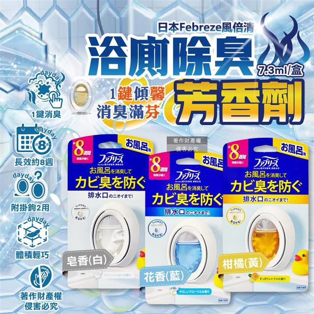 日本Febreze風倍清-淨味持香約8週浴室廁所消臭芳香劑7.3ml/盒(附掛鉤可放置吊掛2用/按鈕型1鍵除臭/如廁淨化空氣防臭香氛盒/衛浴去味擴香)