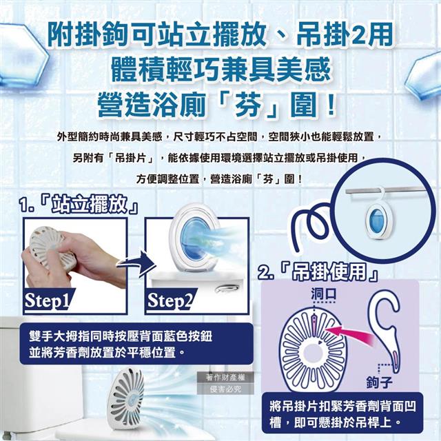 (2)香味會逐漸散發,建議放置於高於馬桶之穩固處,或掛於毛巾架等位置。