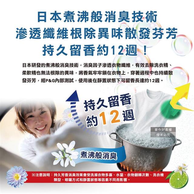 日本煮沸般消臭技術,衣物潔白不易泛黃約120天,持久留香約12週!