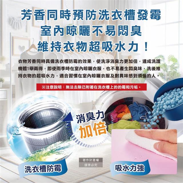 ●不挑洗衣機型溶解快,芳香同時預防洗衣槽發霉,室內晾曬不易悶臭!