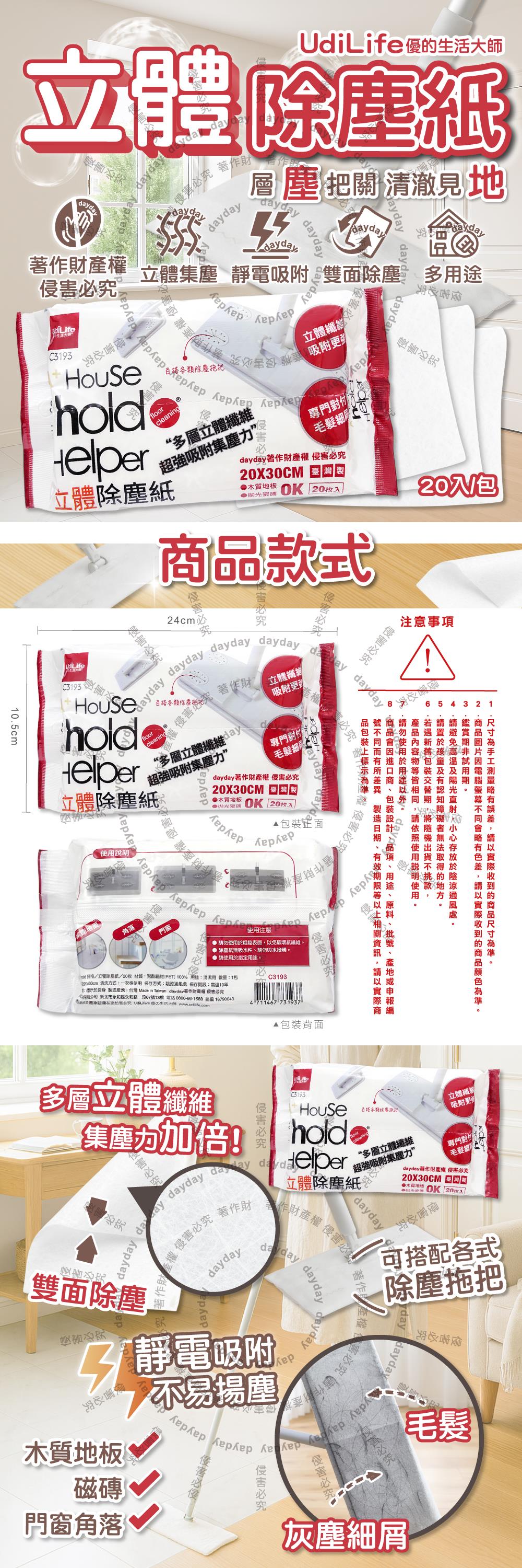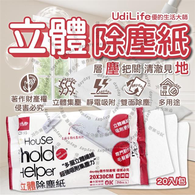 Udilife優的生活大師-hold好拖一次性雙面用立體除塵紙20入/包C3193(居家多用途拋棄式清潔布/家具地板掃除可替換擦巾/靜電集塵多層乾式紙巾)