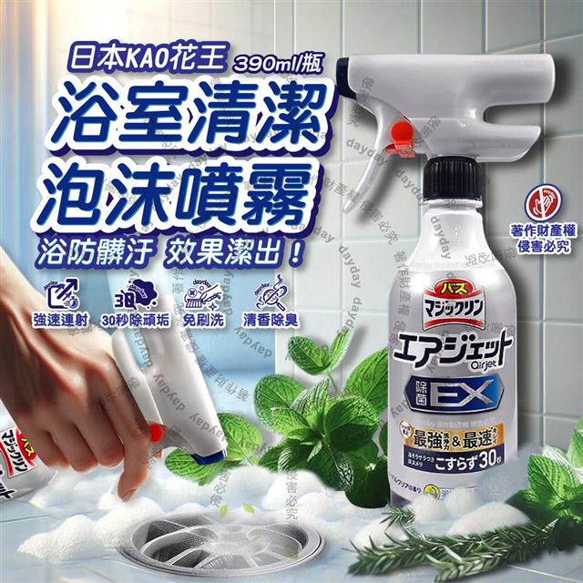 日本KAO花王- Air Jet強速連射洗淨力浴室清潔泡沫噴霧390ml/瓶-清香藍(衛浴地板防粉紅汙漬/排水口消臭芳香防霉/廁所淋浴間黏液髒垢多效洗滌)
