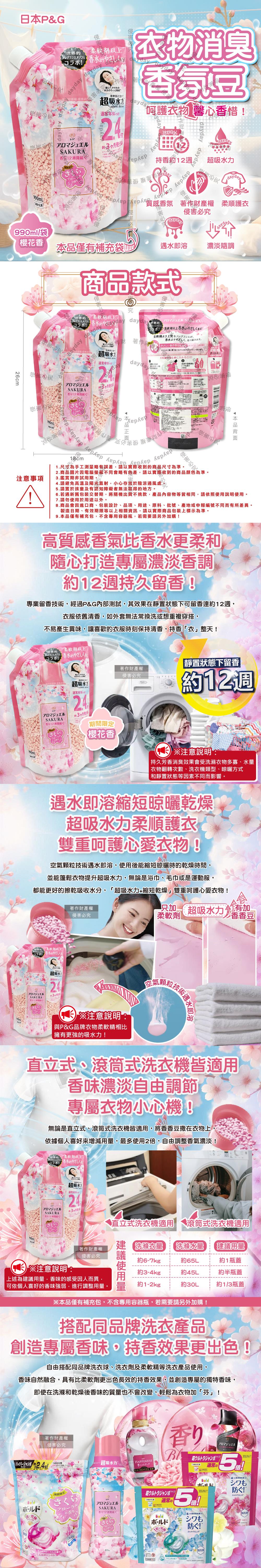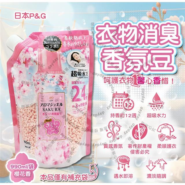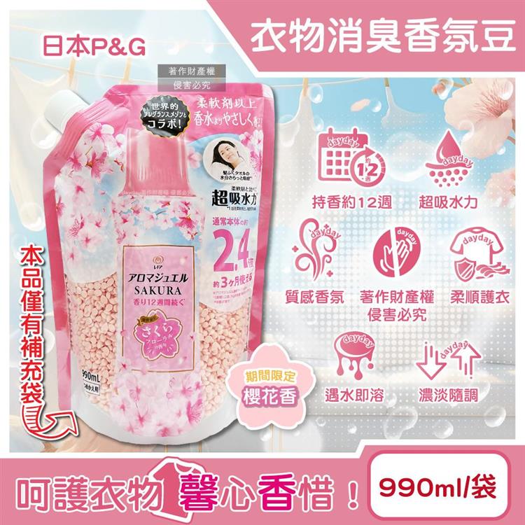 日本P&G-Lenor芳香寶石系列超吸水力顆粒香香豆補充包990ml/袋-櫻花香粉(持香約12週/期間限定留香珠/室內晾曬消臭柔順護衣/全洗衣機型適用)