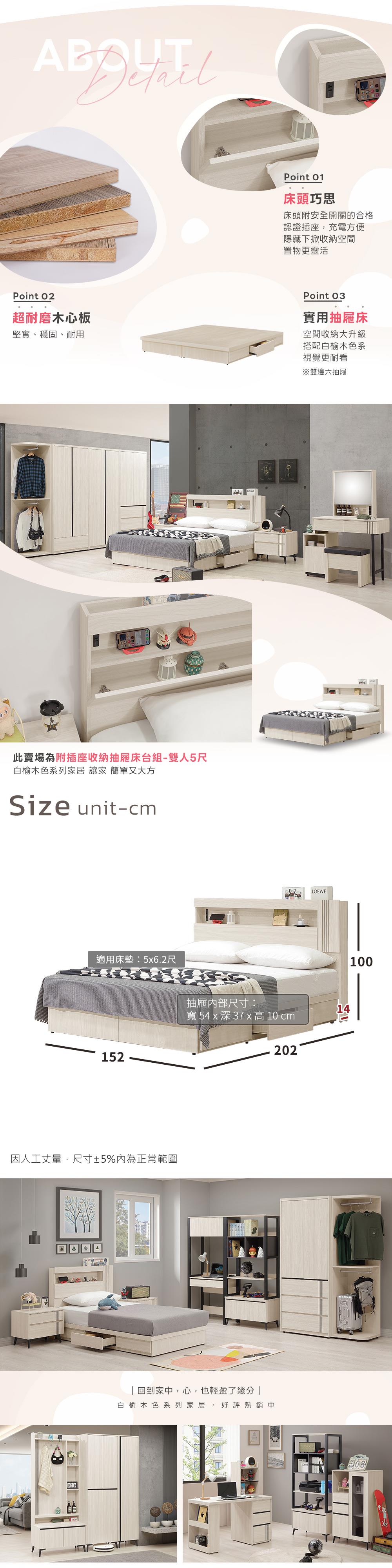 整組商品:5尺床頭片 x 1 + 5尺抽屜床 x 1