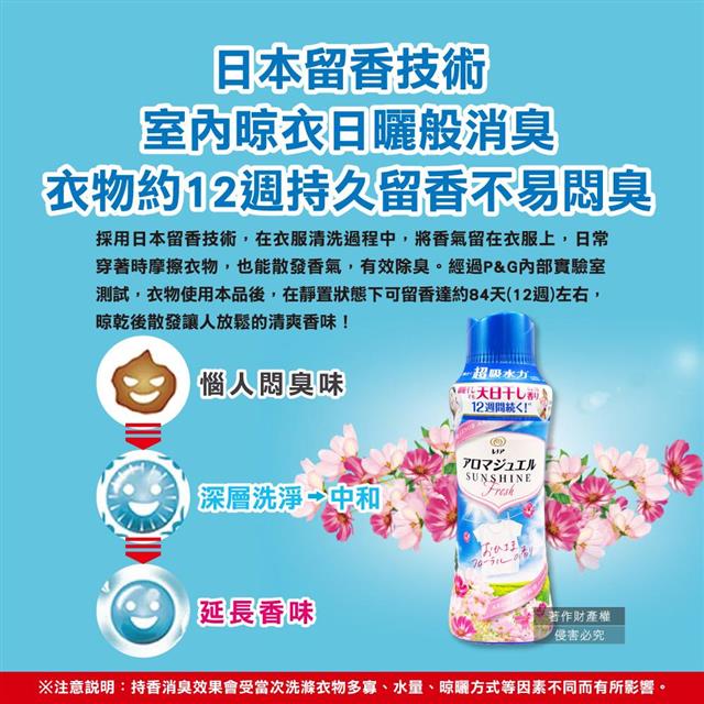 (12)持香消臭效果會受當次洗滌衣物多寡、水量、晾曬方式等因素不同而有所影響。