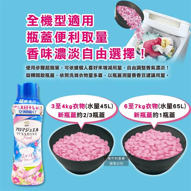●全機型適用,瓶蓋便利取量,搭配同品牌洗衣產品,打造專屬濃淡香氣!