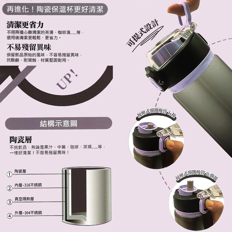 • 台灣製造品質安心,造型優美時尚,超越一般保溫杯,瓶身內層採用316不鏽鋼+陶瓷塗層材質,陶瓷塗層不挑飲品,不易殘留異味,污垢不易殘留好清洗,耐酸鹼抗腐蝕耐高溫堅固耐用,具保冷保溫雙用途,其獨特的彈蓋按壓式彈跳吸管設計,讓您輕鬆一按,即可隨時暢飲,EASY一指彈開安全鎖扣,底部止滑設計,不易滑動,不怕刮傷,可提式攜帶方便,讓您隨時隨地都能享受熱飲或冷飲,為自己的生活品質加分。