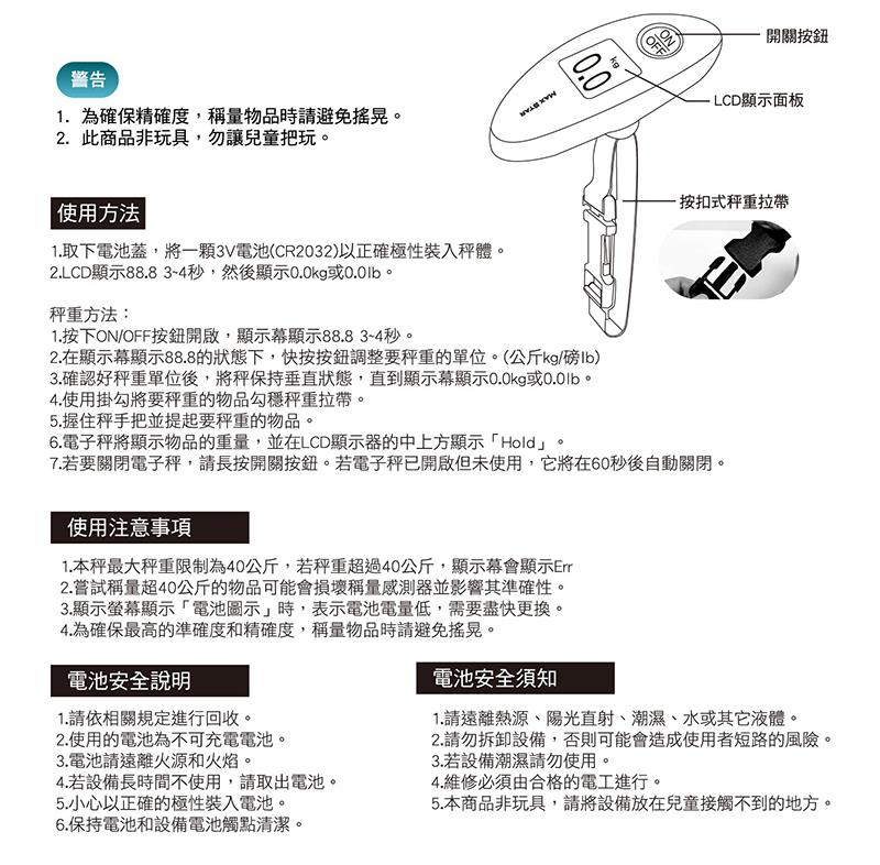 1.本行李秤僅為家庭、個人使用之「非供交易使用之衡器」,不具價格顯示功能。