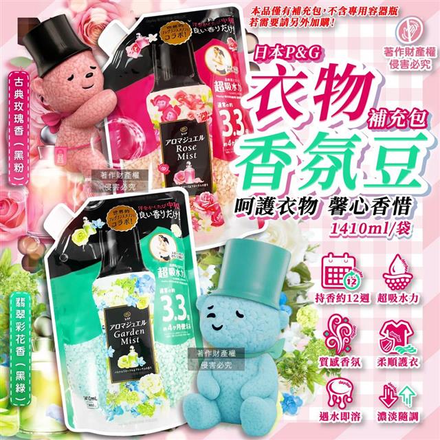 日本P&G-Lenor芳香寶石系列超吸水力顆粒香香豆補充包1410ml/1袋(長效留香約12週/毛巾運動服消臭柔軟劑/室內晾曬防臭/全機型適用洗衣香氛珠)