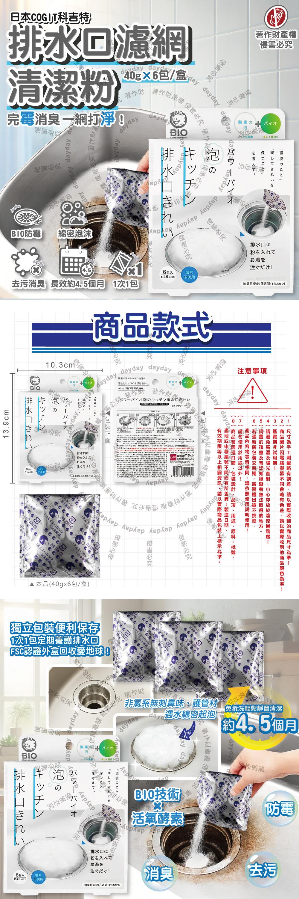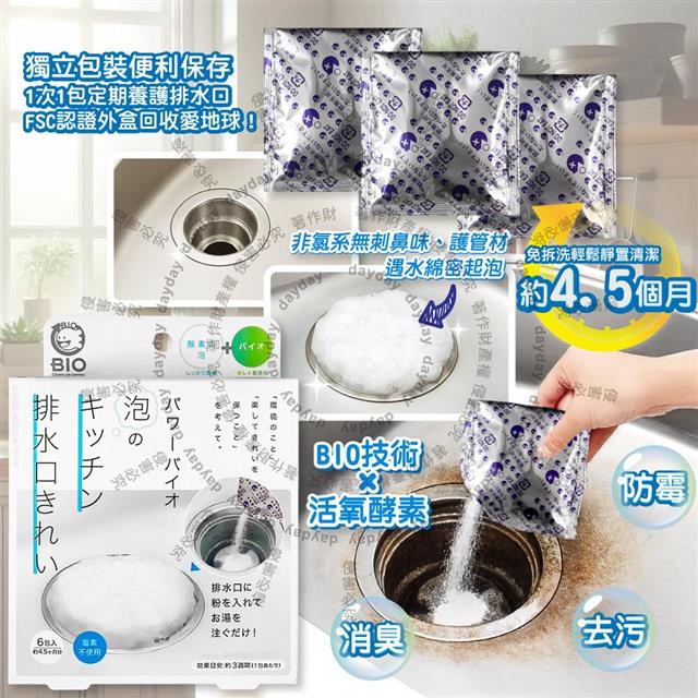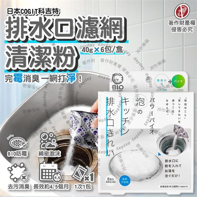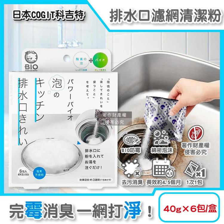 日本COGIT科吉特-BIO廚房排水口濾網去污消臭防霉清潔粉40gx6包/盒 (流理臺排水孔非氯系除垢粉/菜渣過濾器發泡洗滌劑/不鏽鋼提籠靜置潔淨)