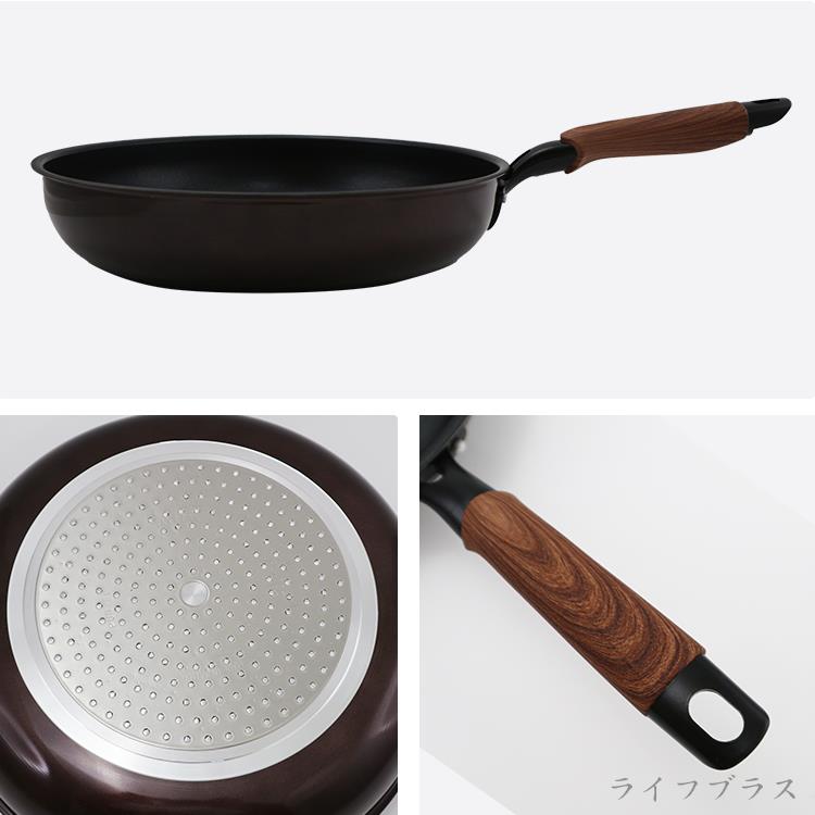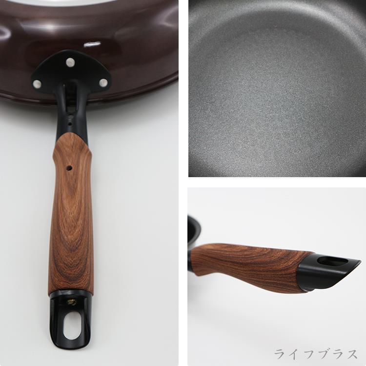日本製造品質保証,採用合金+日本大金不沾塗層,可用鐵鏟超耐磨超耐用,傳熱快速,導熱更均勻,儲熱性佳,適用IH電磁爐、紅外線爐、瓦斯爐、電爐、鹵素爐,仿木柄質感溫潤時尚美觀,一鍋多用料理食物好鍋具。