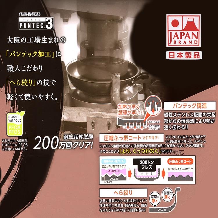 日本製造品質保証,採用合金+日本大金不沾塗層,可用鐵鏟超耐磨超耐用,傳熱快速,導熱更均勻,儲熱性佳,雙引水導角設計不回漏,適用IH電磁爐、紅外線爐、瓦斯爐、電爐、鹵素爐,仿木柄質感溫潤時尚美觀,一鍋多用料理食物好鍋具。