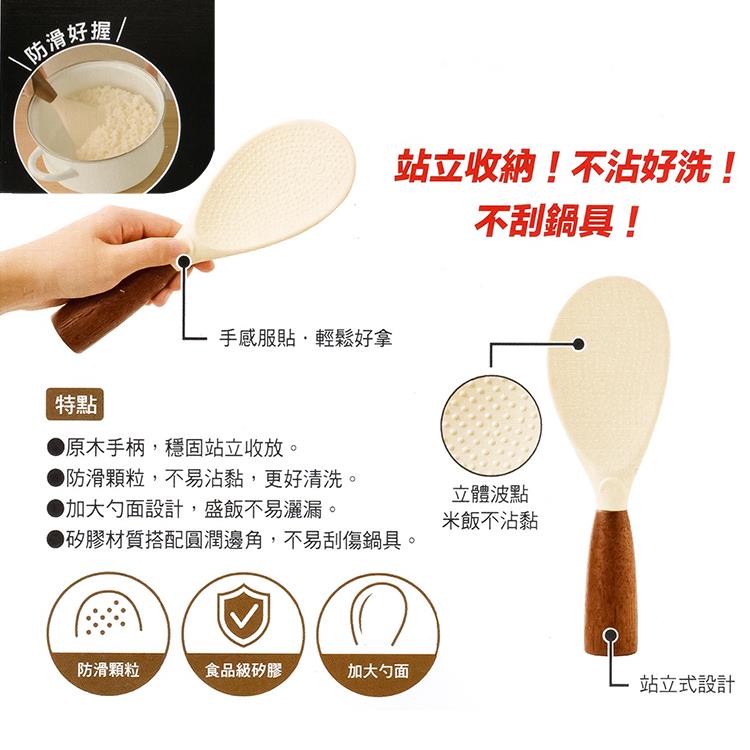通過SGS檢驗合格通過,這款飯匙結合了高品質的矽膠不沾材料與精緻的木柄設計,不僅提升了耐用性,還能有效避免飯粒粘黏,站立式的設計,讓您輕鬆取用,這款飯匙都是您廚房中的得力助手。
