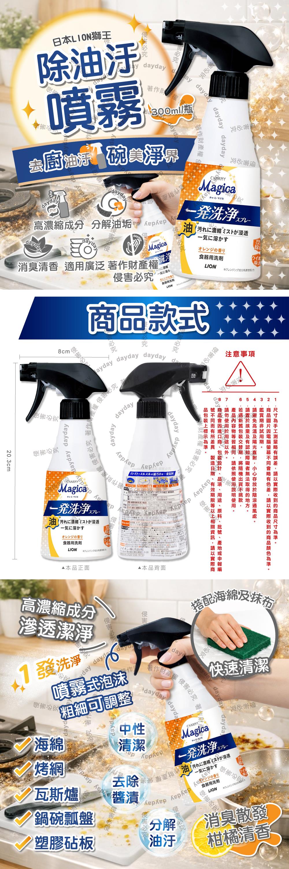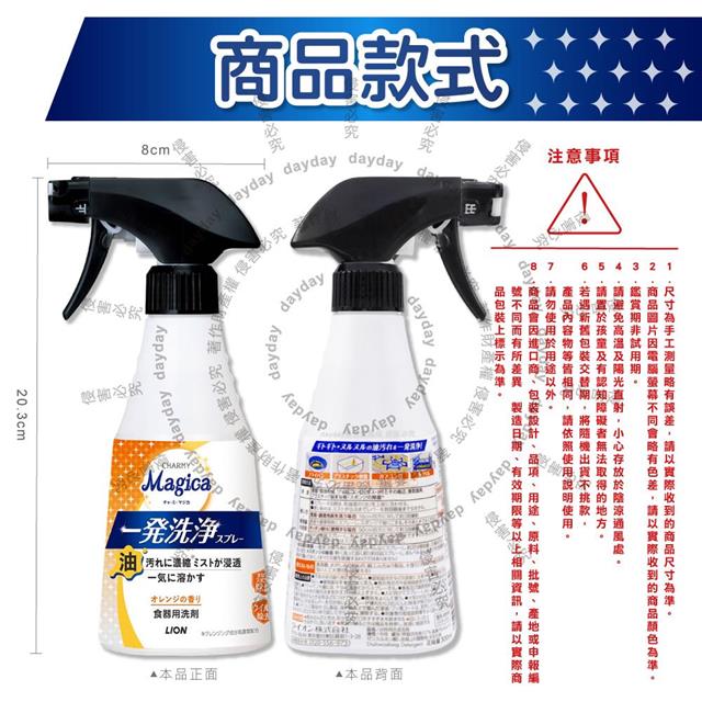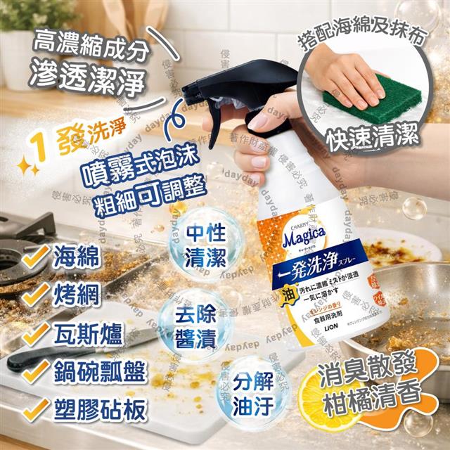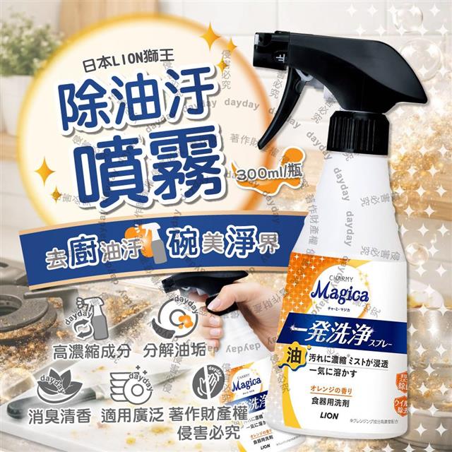 日本LION獅王-CHARMY Magica一發洗淨餐具廚房除油汙噴霧清潔劑300ml/瓶-橘香(鍋碗瓢盆去醬漬洗潔精/爐具烤網去髒汙/砧板海綿防異味)